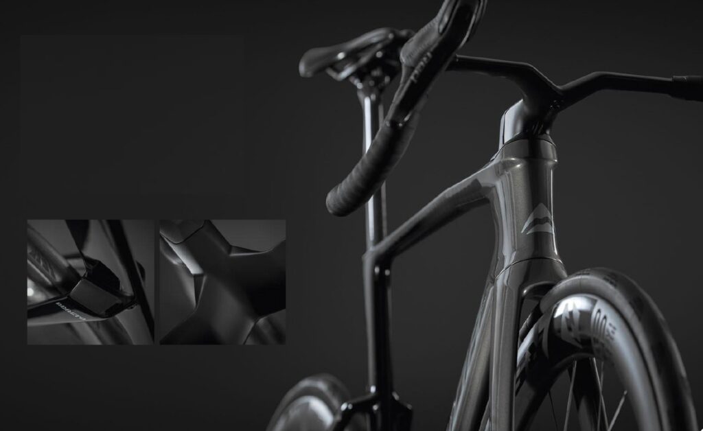 これまでの「軽さゆえの制約」を打破し、新たな製造プロセスで力強い造形を獲得。ヨットの帆を彷彿とさせるダウンチューブの意匠や、随所に配された「V」のモチーフが、ひと目でREACTOと分かる唯一無二の存在感を放ちます。エッジの効いたプリズム形状は、光の反射すらもデザインの一部に変えています。