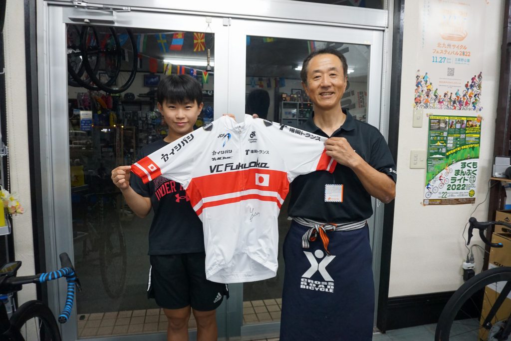 全日本ロードジャージ 投稿日時: 2022年10月22日 投稿者: admin 6月26日に開催された 2022 ジュニア全日本自転車競技選手権大会 女子U-17 において見事優勝を獲得した江崎 結衣選手が所属する VC Fukuoka の全日本ジャージを持参して来店いただきました。 中学生ながら年上の高校生相手に優勝を勝ち取るとは今後の活躍も楽しみですね! いただいたジャージは有難く店内に飾らせてもらいまーす。 2022ジュニア全日本選手権ロード⇒ 記事 KAB熊本朝日放送 ⇒ くまパワ