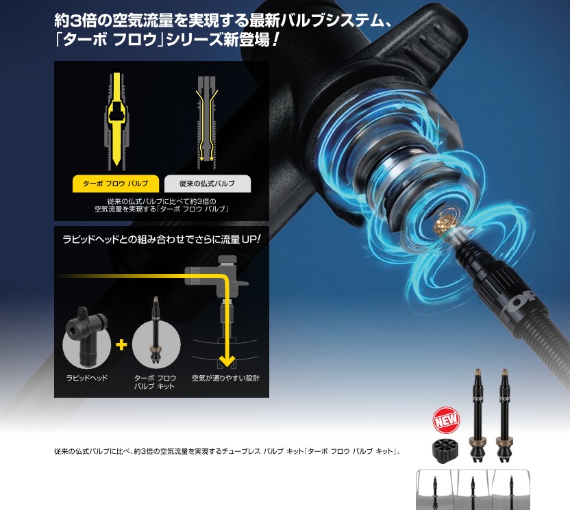 TOPEAK ターボ フロウ 投稿日時: 2025年10月10日 投稿者: admin この時期は自転車界の来年度に向けての展示会が多く開催されます。 先日も大阪に出向き1日で5件(代理店&メーカー)の展示会をハシゴしてきました。 そのなかで、これは! と思われるアイテムをぼちぼちご紹介していこうと思います。 先ず初めは TOPEAKの「ターボ フロウ バルブ 」と「ターボ フロウ バルブ コンボ」 約3倍の空気流量を実現した新バルブシステムです。 従来のバルブコアと取り替えるだけです。 これは使える! どうぞお試しください。