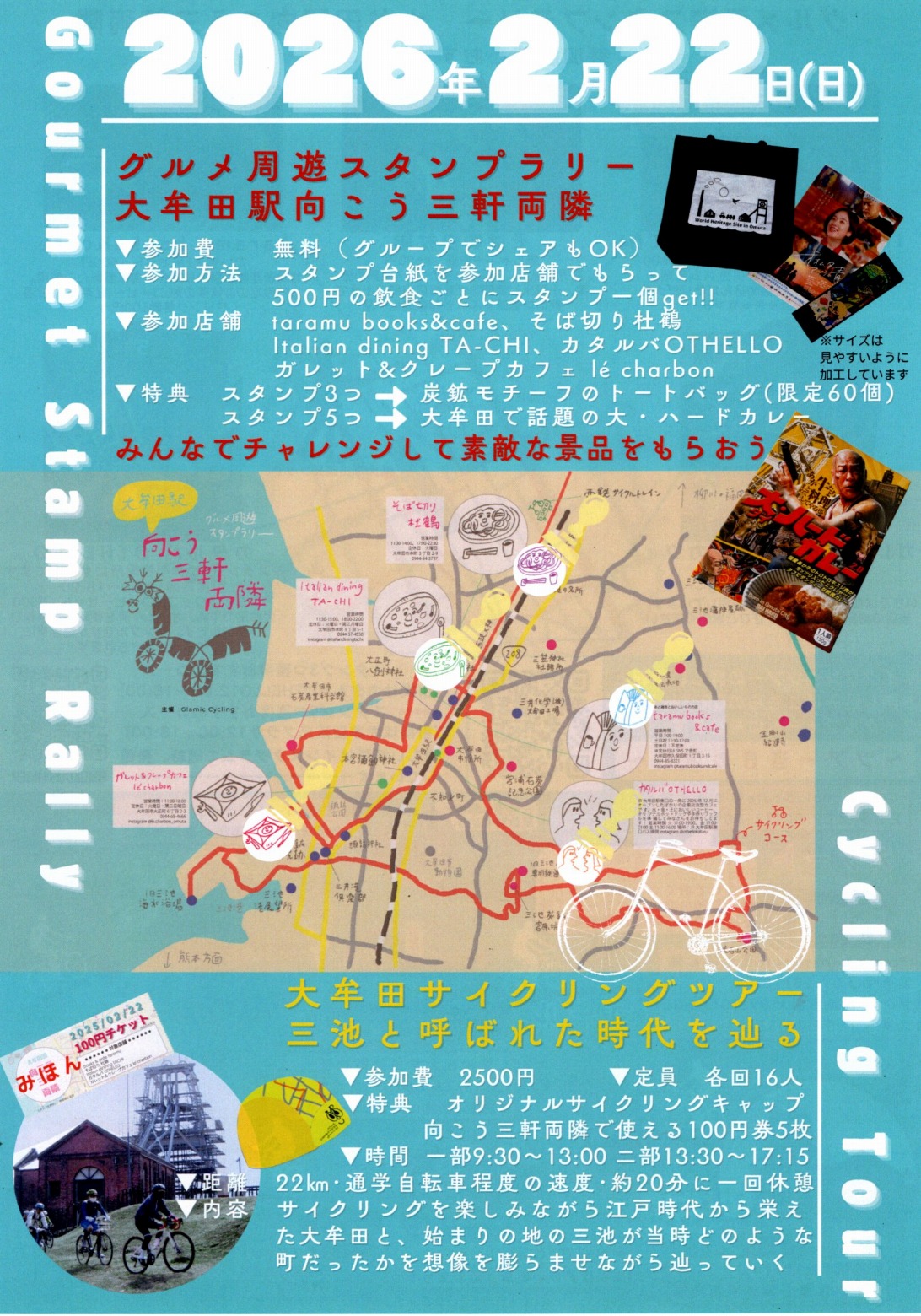 さらに、当日はグルメスタンプラリーも同時開催!参加者には特別クーポンと限定サイクリングキャップをプレゼント🎁