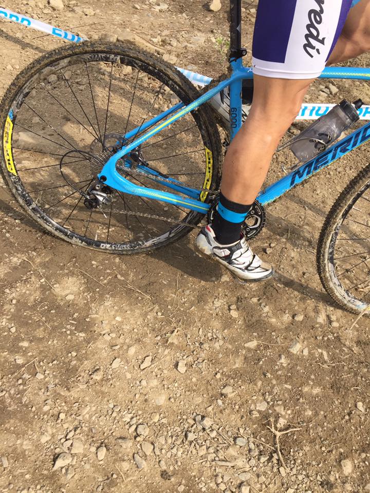 ピットエリアで急いでホイールを交換。昨今のシクロクロス車は悪条件での信頼性からディスクブレーキ仕様が浸透してきつつあり、類にもれず私のシクロクロス車もディスクブレーキだ。フレームの固定はロードバイクのそれと違い、固定力を増すためにスルーアクスルが採用されている。慣れないスルーアクスルだが思った以上にスムーズに換装することができた。